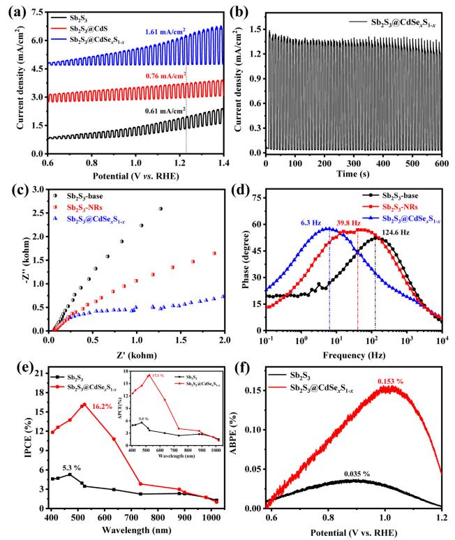 圖3. (a) Sb2S3和Sb2S3@CdSexS1-x的LSV曲線,(b) LIT曲線,(c) Nyquist圖,(d) Bode相位曲線,(e) IPCE和APCE,以及(f) ABPE光譜。