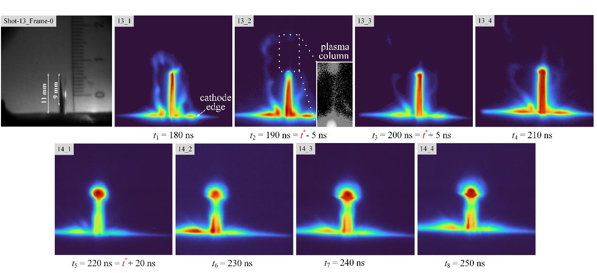 研究結果表明:EWE等離子體的運動可分為三個階段:(1)初始階段,金屬絲爆炸產(chǎn)生等離子體,冷密的絲芯主體質量與電流路徑保持靜止;(2)運動階段,部分等離子體受磁壓力作用向陽極桿尖端移動;(3)X射線輻射階段:受等離子體不穩(wěn)定影響,原電流路徑耗散,電子在磁絕緣的陰陽極間隙中發(fā)射與加速,在陽極尖端聚焦,產(chǎn)生X射線輻射。此外,研究團隊通過電路分析發(fā)現(xiàn),二極管電壓在X射線輻射前開始上升,這一階段的電壓主要來源于等離子體的高速運動及其電流回路擴張帶來的電感的快速變化。隨著原電流路徑的耗散,二極管阻性電壓形成強電場加速電子,*終產(chǎn)生高能X射線。同時,研究團隊利用FLASH磁流體模擬進一步驗證了實驗發(fā)現(xiàn)。本研究首次系統(tǒng)性地揭示了WS-RPD的等離子體動力學過程,并為未來優(yōu)化低阻抗RPD的X射線轉換效率提供了實驗數(shù)據(jù)和理論模型。