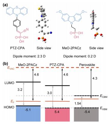 研究人員設計了一種基于苯并噻嗪(PTZ)的兩親性分子空穴傳輸材料PTZ-CPA,其結構中含有氰基乙烯基膦酸(CPA)基團。與之前常用的咔唑基空穴傳輸材料MeO-2PACz相比,PTZ-CPA展現(xiàn)出更高的分子偶極矩(~2.3 D),這有助于在ITO/HTL/鈣鈦礦界面處更有效地傳輸空穴。此外,PTZ-CPA的HOMO能級更深(-5.50 eV),與FAPbI3的價帶*大值(VBM)對齊更好,從而優(yōu)化了界面處的空穴收集效率。