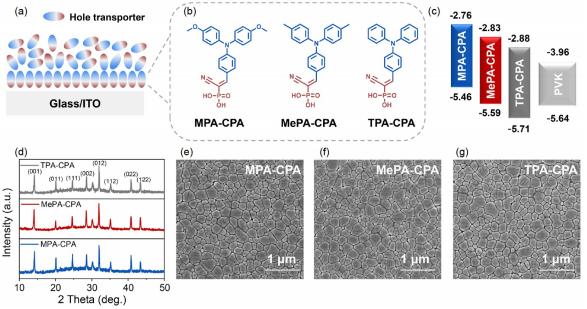 在p-i-n結(jié)構(gòu)中,鈣鈦礦沉積在空穴選擇性層(HSL)上,因此HSL的性質(zhì)對鈣鈦礦吸收層的結(jié)晶過程至關(guān)重要。理想的HSL應(yīng)具有高潤濕性、良好的鈣鈦礦結(jié)晶能力、界面缺陷鈍化能力和與WBG鈣鈦礦價(jià)帶的良好能級對齊。本研究中,通過改變?nèi)桨坊鶊F(tuán)上的取代基(甲氧基、甲基和氫),合成了三種CPA基HSMs,分別為MPA-CPA、MePA-CPA和TPA-CPA。這些分子在ITO基底上動(dòng)態(tài)形成雙層結(jié)構(gòu),顯著改善了鈣鈦礦薄膜的質(zhì)量和器件性能。