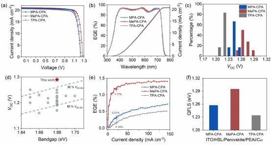 研究人員通過調(diào)整HSMs的能級,顯著提高了WBG-PSCs的開路電壓(VOC)。圖2a展示了基于不同HSMs的WBG-PSCs的電流密度-電壓(J-V)曲線。結(jié)果顯示,基于MePA-CPA的器件實(shí)現(xiàn)了1.29 V的VOC和22.3%的光電轉(zhuǎn)換效率(PCE),這是目前報(bào)道的WBG-PSCs中VOC損失*低的值(0.39 V)。