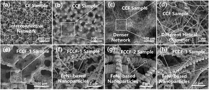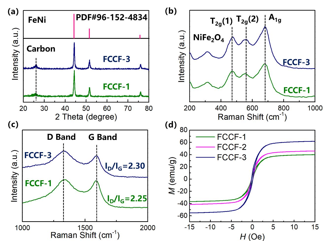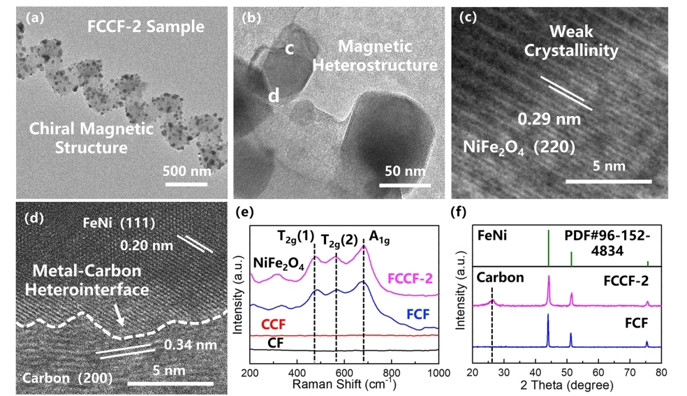 FCCF復(fù)合材料的TEM圖像如圖3a-d所示,F(xiàn)CCF復(fù)合材料的拉曼光譜如圖3e,圖2S(b,c)所示, CF和CCF樣品在0-1000 cm-1區(qū)域沒有拉曼峰。對于FCCF和FCF復(fù)合材料,FeNi基粒子的引入導(dǎo)致在480 cm-1、570 cm-1和683 cm-1處出現(xiàn)三個主峰,對應(yīng)于NiFe2O4的T2g(1)、T2g(2)和A1g振動模式。拉曼光譜結(jié)果進(jìn)一步證實了FeNi基顆粒中存在NiFe2O4,這與TEM圖像一致。FCCF-1和FCCF-3樣品的XRD圖和拉曼光譜與FCCF-2樣品的XRD圖和拉曼光譜高度一致,表明FCCF-1及FCCF-3中也合成了FeNi/ NiFe2O4磁性異質(zhì)結(jié)構(gòu),成功建立了具有手性磁性單元的3D互連網(wǎng)絡(luò)。