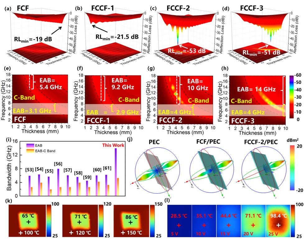 圖四:CCF和FCCF復(fù)合材料的微波吸收性能及多功能特性。