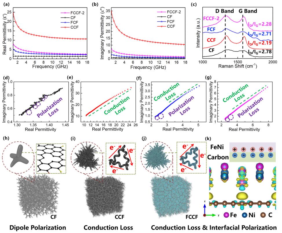 圖五:CCF和FCCF復(fù)合材料的介電常數(shù)及拉曼光譜。