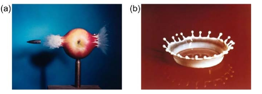 圖1. 高速頻閃攝影照片[1](a)子彈穿過蘋果的瞬間(b)奶?;使?/span>