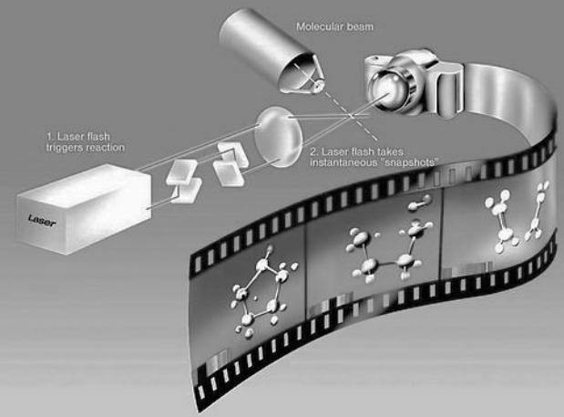 1980年代,學(xué)院教授艾哈邁德.澤維爾(Ahmed H. Zewail)基于抽運-探測(Pump-probe)技術(shù)提出了飛秒化學(xué),使人們對于超快過程的研究延伸到了飛秒尺度。澤維爾的泵浦-探測“相機(jī)”,拍下了化學(xué)反應(yīng)過程。泵浦-探測的原理, 可以理解為將那匹賽馬換成了一束激光,讓它重復(fù)跑上多次,攔在跑道上的只有一根“線”,每次都移動納米級別的距離,用光速來除一下,正好對應(yīng)著飛秒級別的時間間隔。用這種方法,人類首次像看足球慢鏡頭回放一樣,看到了化學(xué)反應(yīng)中原子和分子的運動。