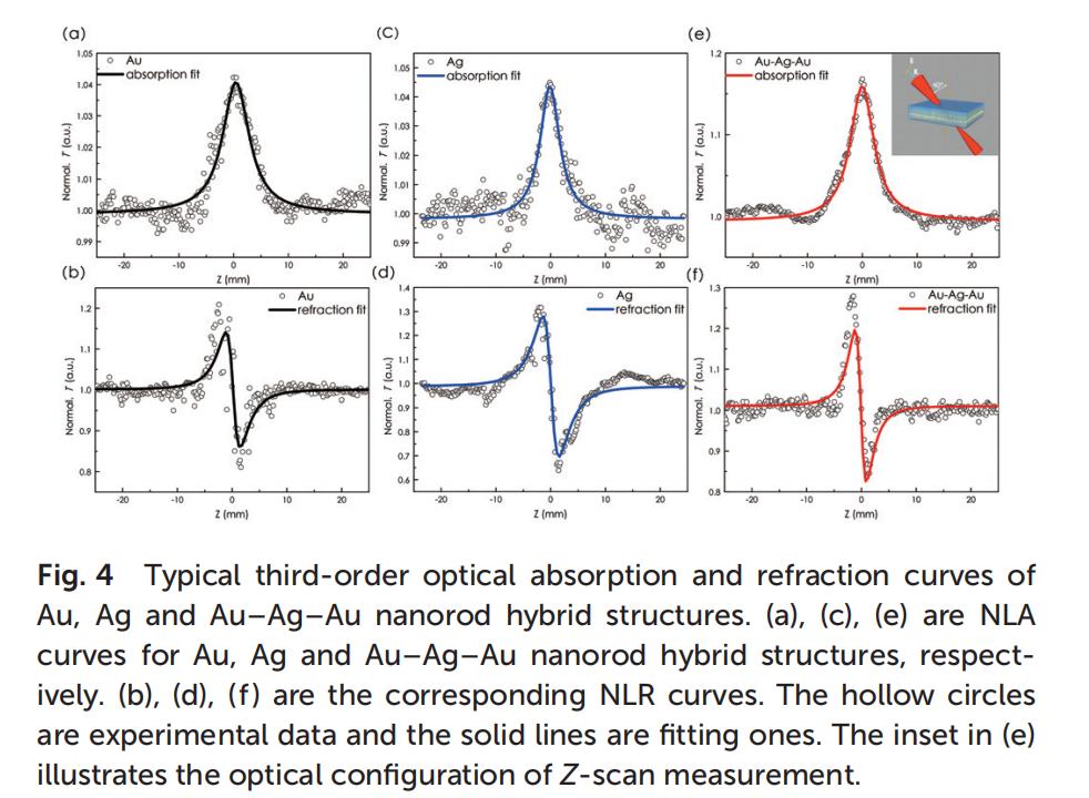 同時(shí),使用鈦寶石激光器作為光源,脈沖寬度為130 fs,重復(fù)率為76 MHz。使用衰減器調(diào)節(jié)激發(fā)功率,使用半波片和Glan-Taylor棱鏡改變激光偏振。激光束通過凸透鏡聚焦?;旌辖Y(jié)構(gòu)固定在旋轉(zhuǎn)平臺(tái)上,該平臺(tái)安裝在電動(dòng)平移臺(tái)上。透射激光由探測器收集。使用光闌在開孔狀態(tài)和閉孔狀態(tài)之間切換,進(jìn)行了ZScan的相關(guān)測試。