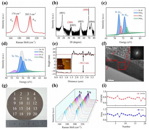 圖1 (a)PtSe?薄膜的拉曼光譜。(b)沉積于SiO?/Si基底上的PtSe?薄膜的X射線衍射(XRD)圖譜。(c,d)PtSe?薄膜的X射線光電子能譜(XPS),分別為Pt 4f和Se 3d譜圖。(e)PtSe?薄膜的原子力顯微鏡(AFM)圖像。(f)PtSe?的透射電子顯微鏡(TEM)圖像。(g)覆蓋PtSe?薄膜的3英寸SiO?/Si基底的照片。(h)拉曼光譜中Y軸數(shù)據(jù)彩色映射的三維瀑布圖。(i)3英寸硒化物樣品的A?g/Eg峰面積與半高寬(FWHM)關(guān)系圖。