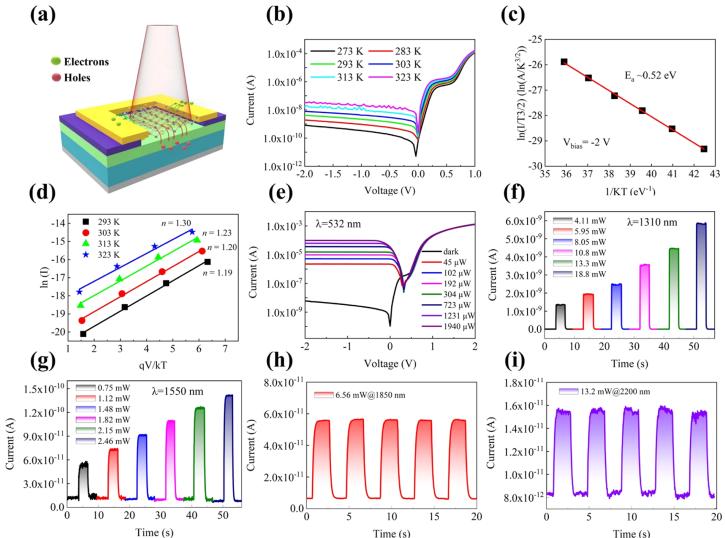 圖2 (a)器件結(jié)構(gòu)示意圖。(b)不同溫度下的I−V特性曲線.(c)活化能.(d)理想因子。(e−i)532至2200納米的光響應(yīng)。