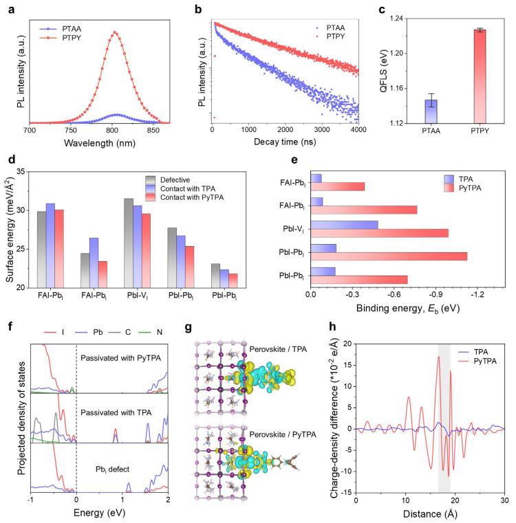 圖1 a)和(b)在PTAA和PTPY上沉積的鈣鈦礦薄膜的穩(wěn)態(tài)光致發(fā)光(PL)光譜和時(shí)間分辨光致發(fā)光(TRPL)衰減特性。(c)在PTAA和PTPY上沉積的鈣鈦礦薄膜的準(zhǔn)費(fèi)米能級(jí)分裂(QFLS)值。(d)鈣鈦礦在與TPA或PyTPA接觸前后不同缺陷(碘空位:VI,鉛碘反位缺陷:PbI,以及間隙鉛:Pbi)的表面能。注意,F(xiàn)AI和PbI分別表示FAI終止的(001)面和PbI終止的(001)面。(e)分子與各種缺陷之間的結(jié)合能(Eb)。(f)有缺陷和經(jīng)TPA與PyTPA鈍化后的表面的投影態(tài)密度。價(jià)帶頂?shù)哪芗?jí)設(shè)定為零。(g)TPA和PyTPA組裝在帶有Pbi缺陷的PbI終止鈣鈦礦表面的理論模型。藍(lán)色區(qū)域表示電子耗盡,黃色區(qū)域表示電子積累。(h)分子與Pbi缺陷的PbI終止鈣鈦礦表面之間的計(jì)算電荷密度差。灰色帶表示分子與鈣鈦礦表面之間的界面。
