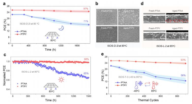 圖3 器件穩(wěn)定性。(a)在氮?dú)夥諊拢↖SOS-D-2l程序)以85°C恒溫加熱的未封裝PTAA和PTPY基器件的熱穩(wěn)定性。(b)從PTAA和PTPY基器件中獲得的鈣鈦礦底層表面的掃描電子顯微鏡(SEM)圖像,分別在85°C加熱約1900小時(shí)前后(標(biāo)尺,1微米)。(c)在85°C下持續(xù)一陽光光照(ISOS-L-2程序)的封裝PTAA和PTPY基器件的持續(xù)*大功率點(diǎn)(MPP)跟蹤。(d)在85°C下進(jìn)行MPP跟蹤1500小時(shí)前后,基于PTAA和PTPY的器件的橫截面掃描電子顯微鏡(SEM)圖像(標(biāo)尺,500納米)。(e)封裝的PTAA和PTPY基器件的熱循環(huán)耐久性(-40至85°C)(ISOS-T-3程序)。