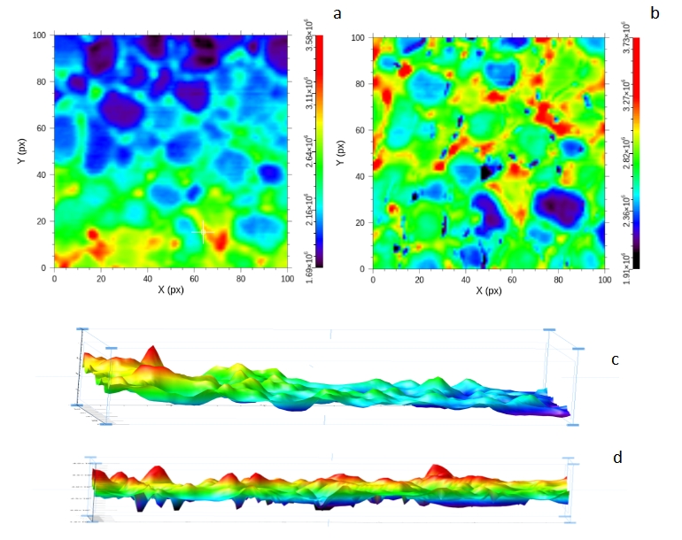 圖 先進(jìn)陶瓷材料,a(非自動聚焦)b(自動聚焦)的拉曼成像平面圖;c(非自動聚焦)d(自動聚焦)的拉曼成像剖面圖