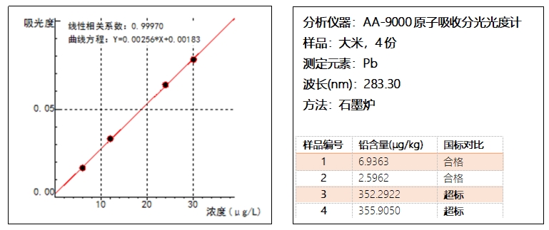 圖2. 標(biāo)準(zhǔn)Pb吸收曲線及大米測(cè)定結(jié)果