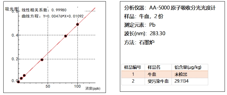 鉛是指血液中含有的鉛元素的量。血鉛超標(biāo)會(huì)引起機(jī)體的神經(jīng)系統(tǒng)、血液系統(tǒng)、消化系統(tǒng)的一系列異常表現(xiàn),影響人體的正常機(jī)能。食品污染、環(huán)境污染可以導(dǎo)致人體血鉛增高,常引起群體性中毒事件。圖3為使用卓立漢光AA-5000原子吸收分光光度計(jì)牛血液中鉛含量測(cè)試的示例。測(cè)試結(jié)果可知,2號(hào)牛血樣品鉛含量為29ppb,受到了鉛污染。