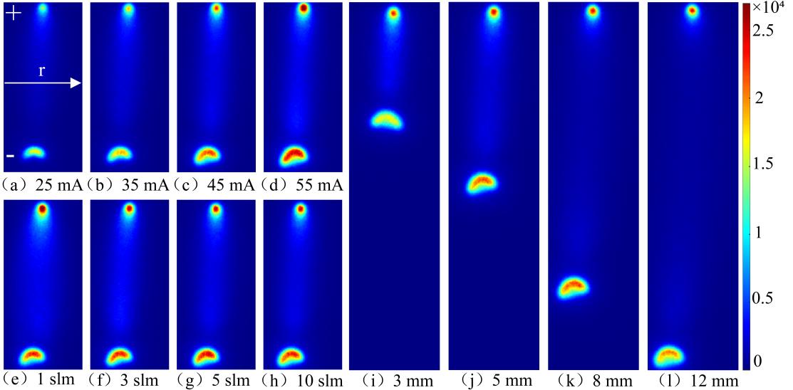 氣體流量的影響(圖1 e-h):在固定電流(45 mA)和間距(5 mm)下,氣流從1 slm增至10 slm。氣流對陽極和陰極區(qū)的等離子體形態(tài)影響明顯,尤其是在陽極附近,隨著流速增加,等離子體直徑更窄,這種現象可以歸因于增強的對流冷卻效應。較高的氣體流量能夠更有效地帶走放電通道邊緣的熱量,抑制其徑向擴展,從而導致放電通道的收縮。