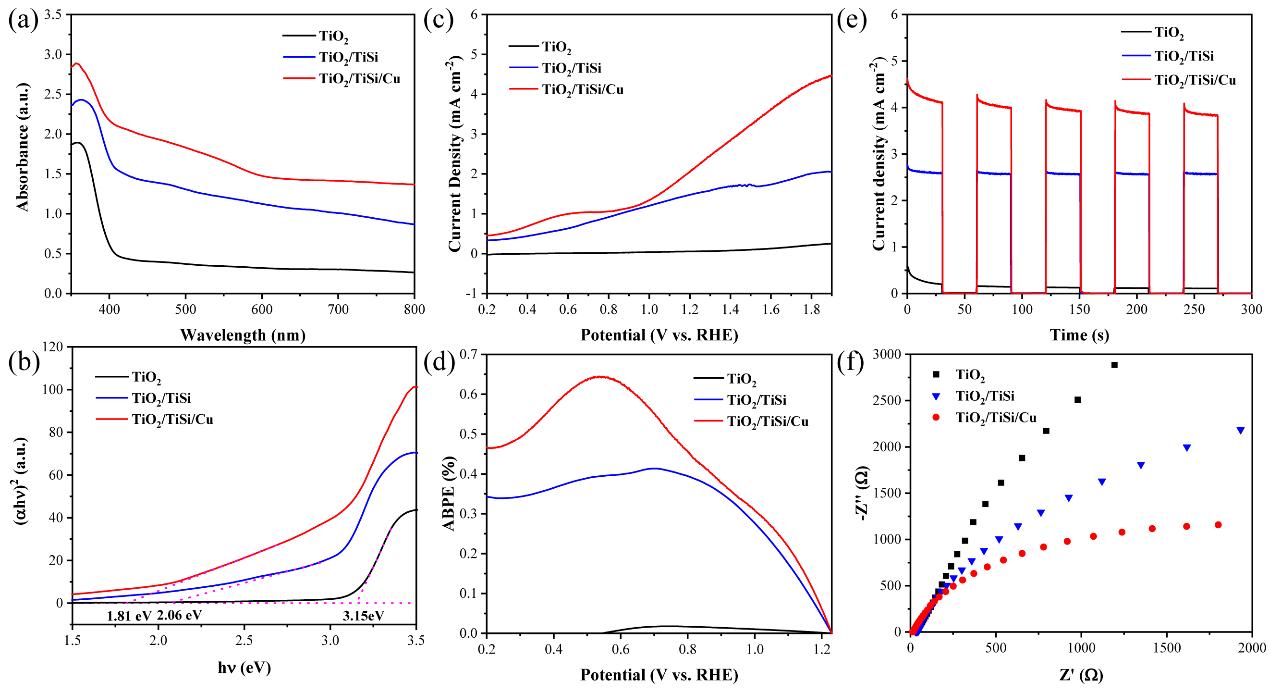 開發(fā)高效、穩(wěn)定的光電催化材料是實(shí)現(xiàn)太陽(yáng)能驅(qū)動(dòng)水分解制氫的關(guān)鍵。湖北工業(yè)大學(xué)等單位的研究團(tuán)隊(duì)結(jié)合磁控濺射與真空熱蒸發(fā)技術(shù),在TiO2納米棒陣列上依次沉積拓?fù)浒虢饘賂iSi薄膜與等離子體Cu納米顆粒,構(gòu)建出TiO2/TiSi/Cu復(fù)合光陽(yáng)極。該結(jié)構(gòu)充分利用TiSi的拓?fù)渚€性能帶結(jié)構(gòu)作為電子的高速傳輸通道,協(xié)同 Cu的表面等離子體共振(SPR)效應(yīng),共同增強(qiáng)光吸收、促進(jìn)載流子分離與傳輸、延長(zhǎng)載流子壽命,進(jìn)而顯著提升可見光驅(qū)動(dòng)下的光電催化分解水性能。在>420 nm可見光照射下,TiO2/TiSi/Cu光陽(yáng)極的光電流密度達(dá)到純TiO2的17.84倍,并表現(xiàn)出優(yōu)異的循環(huán)穩(wěn)定性。這些結(jié)果不僅為TiO2基光陽(yáng)極的性能優(yōu)化提供了新思路,也為拓?fù)洳牧显谀茉创呋I(lǐng)域的應(yīng)用拓展了新的方向。