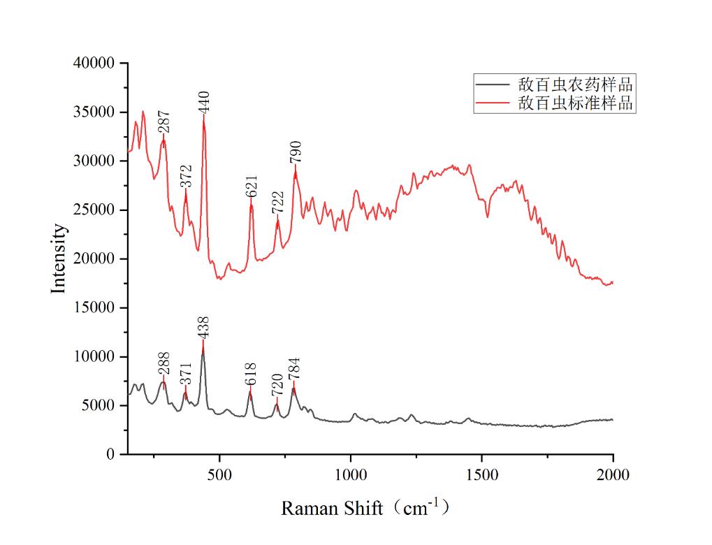 圖2 FE1064-Pro手持式拉曼光譜儀檢測(cè)敵百蟲(chóng)標(biāo)準(zhǔn)品和農(nóng)藥樣品的拉曼光譜圖