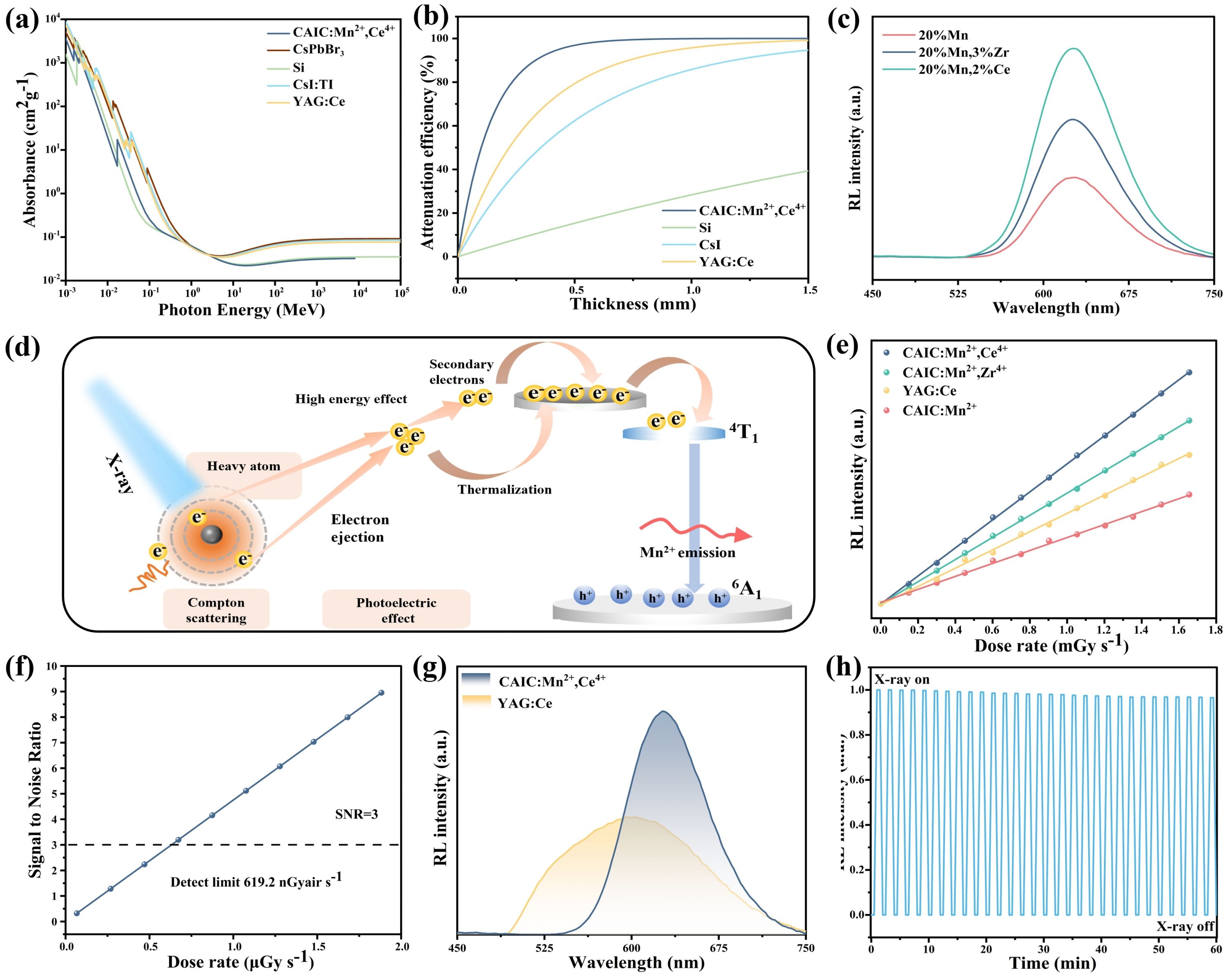 圖2(a)CsPbBr3、Si、CsI-TI、YAG:Ce和CAIC:Mn2+, Ce4+對(duì)光子能量的線性衰減系數(shù);(b)幾種閃爍體在X射線輻射下的衰減效率與厚度的函數(shù)關(guān)系;(c)CAIC:Mn2+、CAIC:Mn2+, Zr4+與CAIC:Mn2+, Ce4+的輻射發(fā)光光譜;(d)提出的輻射發(fā)光機(jī)理圖;(e)CAIC:Mn2+、CAIC:Mn2+, Zr4+、CAIC:Mn2+, Ce4+與YAG:Ce閃爍體的輻射發(fā)光強(qiáng)度隨X射線劑量率的變化;(f) CAIC:Mn2+, Ce4+的X射線劑量率的變化與信噪比SNR的函數(shù)關(guān)系;(g)CAIC:Mn2+, Ce4+與YAG:Ce閃爍體的輻射發(fā)光光譜;(h)連續(xù)30次X射線照射-關(guān)閉循環(huán)下CAIC:Mn2+, Ce4+的輻射發(fā)光強(qiáng)度變化。