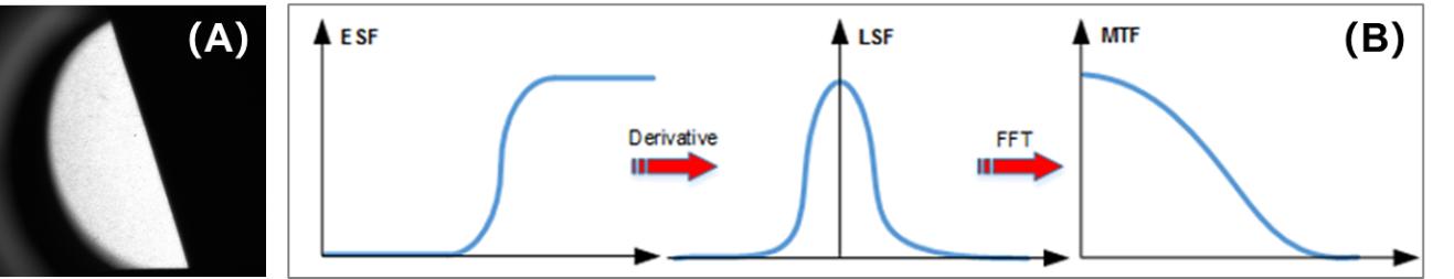 圖4. (A)Pb片邊緣成像(OmniFluo960-XrayP拍攝);(B)MTF算法流程