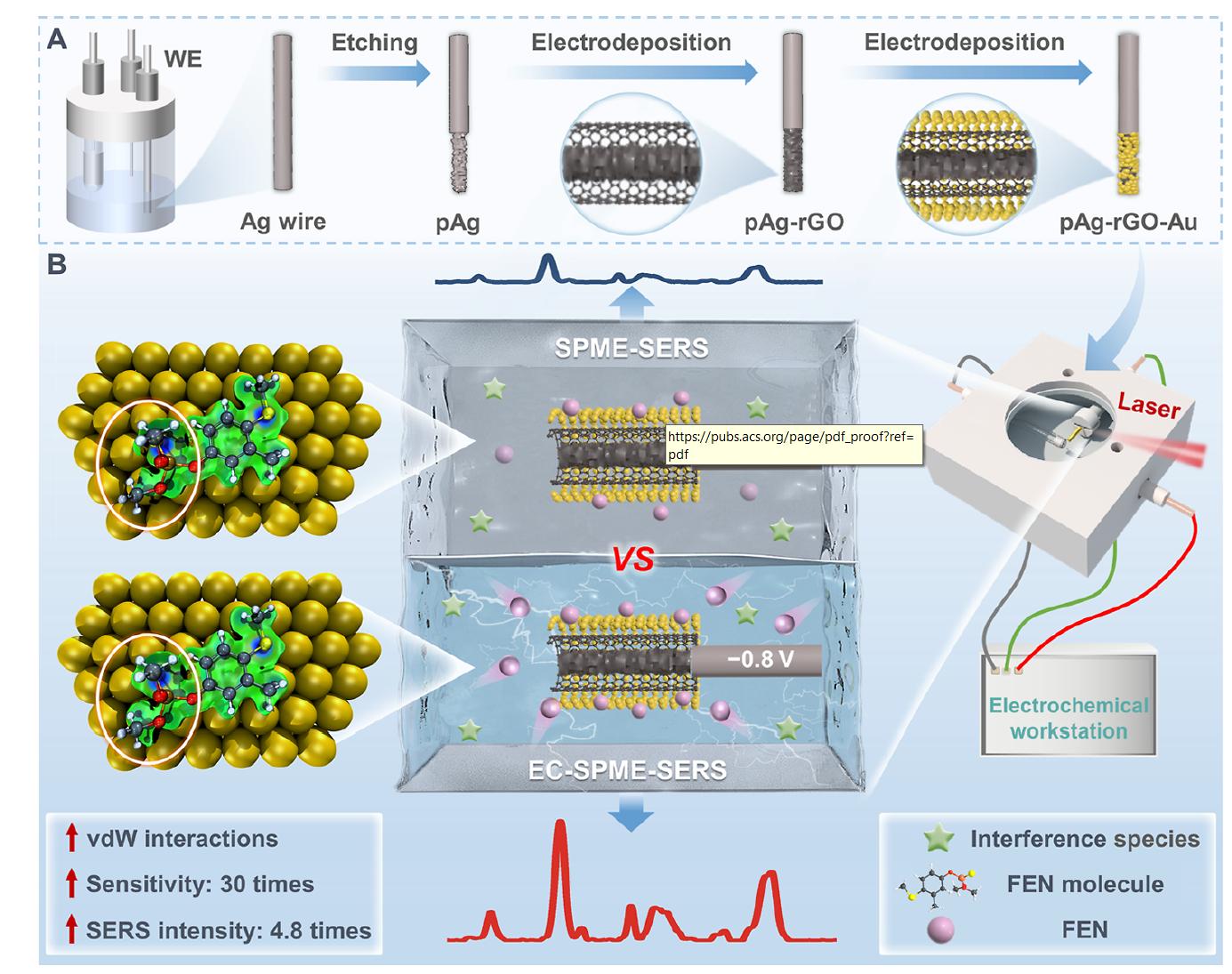 海南大學(xué)食品科學(xué)與工程學(xué)院“納米傳感與光電分析團(tuán)隊(duì)”教授課題組聯(lián)合相關(guān)單位,在《ACSSensors》發(fā)表Development of an Integrated EC−SPME−SERS Platform with the pAg-rGO-Au Substrate for Ultrasensitive Detection of Fenthion研究論文,創(chuàng)新性開發(fā)出基于pAg-rGO-Au復(fù)合基底的EC-SPME-SERS集成檢測(cè)平臺(tái),專門用于食品中倍硫磷(FEN)農(nóng)藥殘留的超靈敏檢測(cè)。該平臺(tái)整合電化學(xué)(EC)調(diào)控、固相微萃?。⊿PME)富集與表面增強(qiáng)拉曼散射(SERS)檢測(cè)功能,解決了傳統(tǒng)SERS檢測(cè)中基質(zhì)干擾強(qiáng)、目標(biāo)分子富集難的問題,檢出限低至2.7nM,較傳統(tǒng)SPME-SERS靈敏度提升30倍,為復(fù)雜食品基質(zhì)中痕量污染物檢測(cè)提供了高效技術(shù)方案。