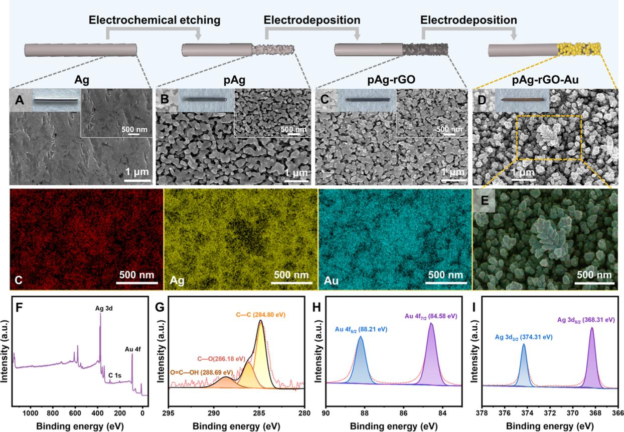 圖1:(A)Ag絲、(B)pAg、(C)pAg-rGO、(D)pAg-rGO-Au的SEM圖像(插圖為實(shí)物照片);(E)pAg-rGO-Au的EDS元素mapping;(F)XPS全譜;(G-I)C1s、Au4f、Ag3d高分辨XPS光譜。