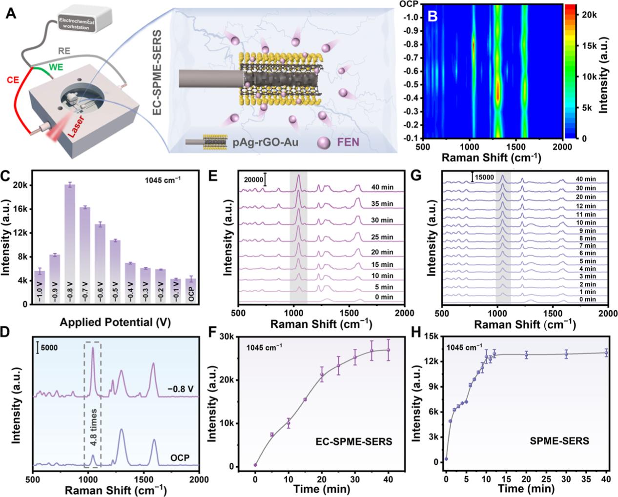 圖3:(A)EC-SPME-SERS裝置示意圖;(B)不同電勢(shì)下FEN的SERS信號(hào)熱圖;(C)1045cm-¹特征峰強(qiáng)度隨電勢(shì)變化;(D)-0.8V與OCP下的SERS光譜對(duì)比;(E-H)EC-SPME-SERS與SPME-SERS的吸附動(dòng)力學(xué)曲線。