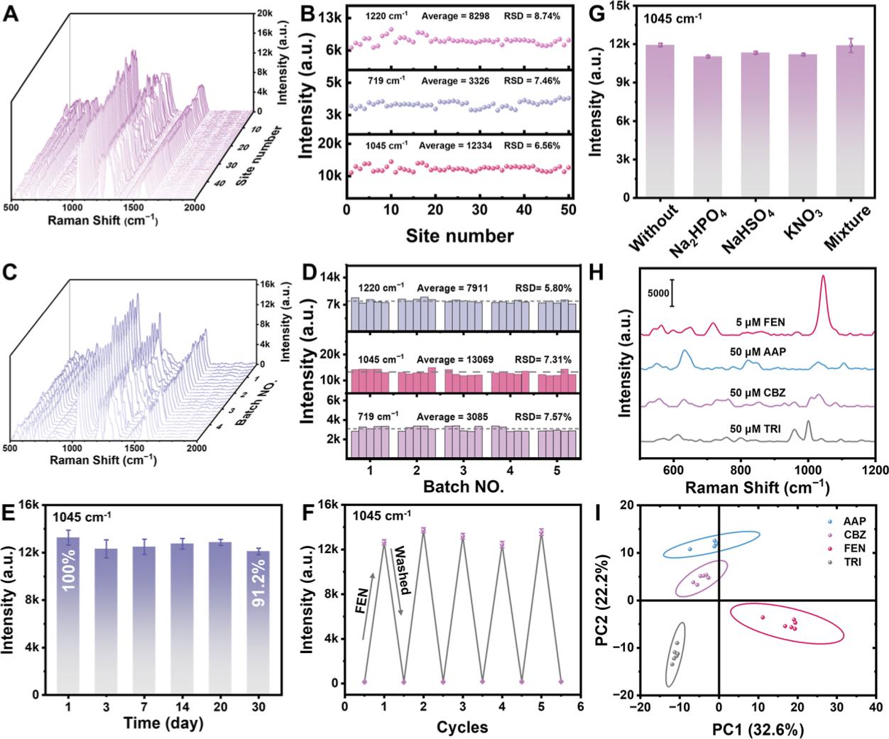 圖5:(A-B)基底均勻性測(cè)試;(C-D)重復(fù)性驗(yàn)證;(E)30天穩(wěn)定性測(cè)試;(F)5次循環(huán)使用性能;(G-H)選擇性測(cè)試與PCA分析。