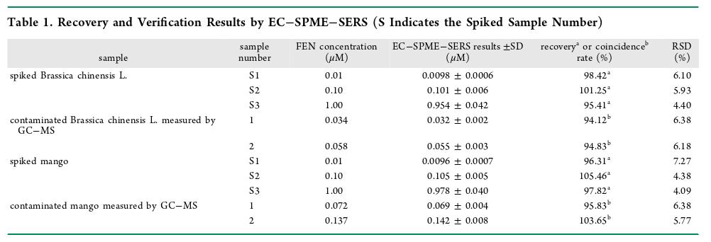 表1實(shí)際樣品中FEN的檢測(cè)結(jié)果(EC-SPME-SERS法)