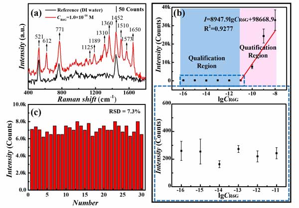 針對(duì)以上問(wèn)題,華南師范大學(xué)金名亮研究員和水玲玲教授課題組通過(guò)在電偶置換反應(yīng)中引入十六烷基三甲基溴化銨(CTAB),在硅基表面成功制備了大面積(4英寸)的銀納米顆粒團(tuán)簇SERS基底。該方法成本低廉,步驟簡(jiǎn)單,且制備的SERS基底具有高靈敏度和較好的信號(hào)重復(fù)性。通過(guò)在反應(yīng)液中引入 CTAB,一方面,CTAB可作為膠束模板,使銀納米顆粒粒徑均勻并有助于形成銀納米顆粒團(tuán)簇;另一方面,在 SERS 檢測(cè)過(guò)程中,吸附在銀納米顆粒表面的 CTAB 分子可富集溶液中的探針?lè)肿樱兄谶M(jìn)一步提高拉曼信號(hào)的增強(qiáng)效果。實(shí)驗(yàn)結(jié)果表明,以羅丹明6G(R6G)為探針?lè)肿訒r(shí),銀納米顆粒團(tuán)簇SERS基底定性檢測(cè)限可達(dá)1.0×10-16 M,相對(duì)標(biāo)準(zhǔn)偏差(RSD)低至7.3%。此外,該SERS基底成功的實(shí)現(xiàn)了在水溶液中高靈敏檢測(cè)氨基酸生物小分子,有望用于實(shí)時(shí)生物分子診斷。