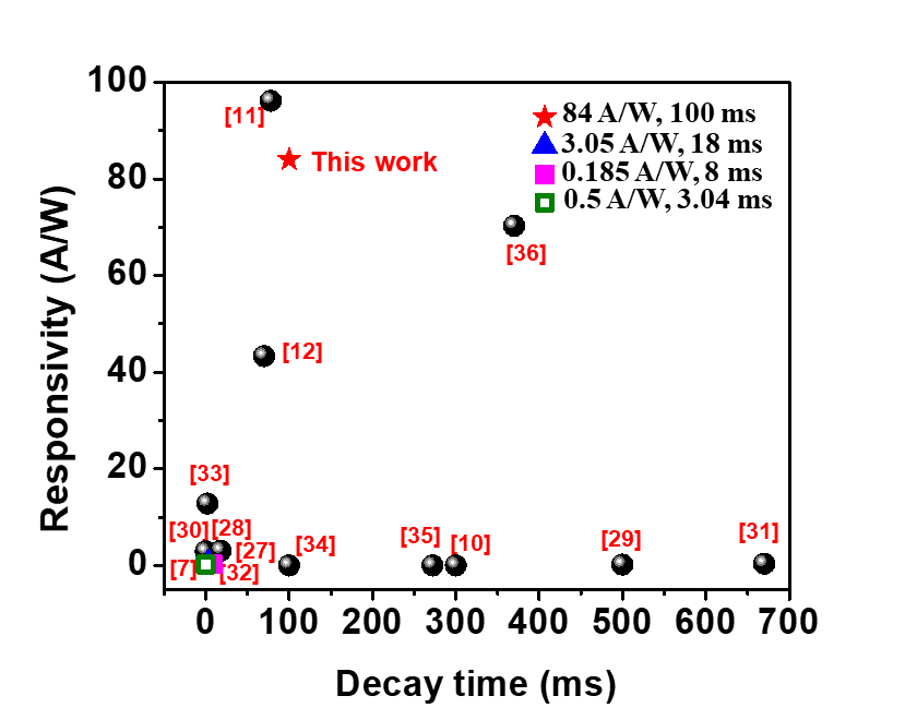 1、開發(fā)出了一種具有高性能和柵極可調(diào)光檢測能力的非晶氧化鎵日盲場效應光電晶體管。采用磁控濺射這種方法可以在Si基襯底上生長低成本、大面積的非晶氧化鎵薄膜。通過對制備的薄膜晶體管施加適當?shù)谋硸烹妷海梢院芎玫乜刂茍鲂怆娋w管的暗電流和光響應特性。制成的氧化鎵薄膜場效應光電晶體管具有出色的深紫外光電探測特性,包括4.1×103 A/W的高光敏性, 2.5×1013Jones的高探測率。并首次基于非晶氧化鎵探測器作為單像素實現(xiàn)日盲成像,使得該日盲非晶氧化鎵薄膜場效應光電晶體管有望用于下一代光電成像應用。(Adv. Electron. Mater. 2019, 5(7), 1900389) 此外,該課題組進一步開發(fā)了基于非晶氧化鎵探測器的集成技術(shù),制備了32×32的大規(guī)模陣列,用于日盲成像,相關(guān)成果正在審稿階段。