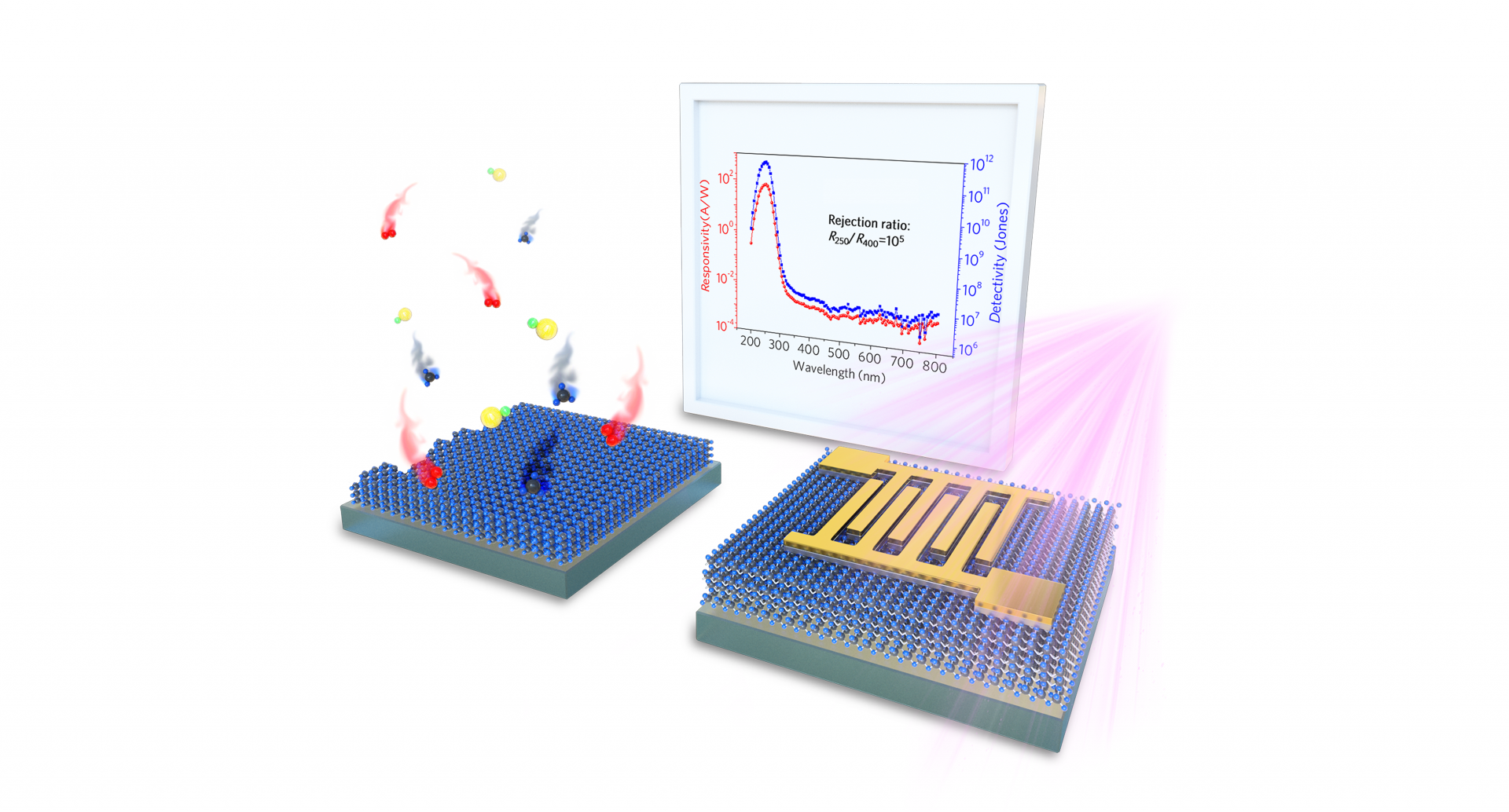 4、針對上述ε-Ga2O3探測器的高響應度,該課題組制備了MSM結(jié)構(gòu)的光探測器,通過研究電流傳輸機制以及原理計算,揭示了器件中的光電流增益機制。氧空位作為類受主缺陷,會捕獲光生空穴,引起空穴積累,從而降低了金屬/半導體接觸勢壘,導致光電流增益。(ACS Photonics, 2020, 7,3, 812-820)