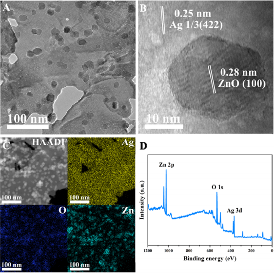 圖1:Ag納米片表面負(fù)載ZnO納米粒子的表征。