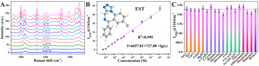 圖3:SERS檢測(cè)單一藥物EST含量的線性圖及其抗干擾性。