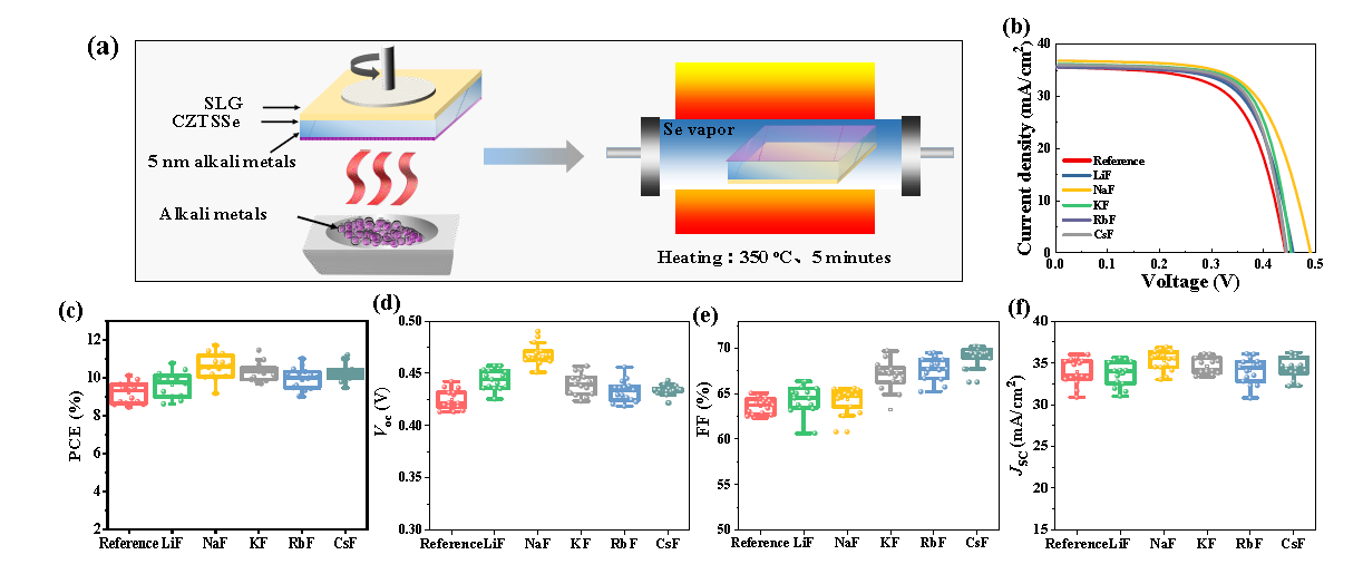 在鋅黃錫礦電池中摻雜堿金屬(AMs)可以有效地促進(jìn)熱載體冷卻,減少缺陷導(dǎo)致的輻射重組,從而提高光伏性能。近年來(lái),堿金屬沉積后處理(PDT)工藝使Cu(In,Ga)Se2太陽(yáng)能電池世界效率取得連續(xù)突破。然而,對(duì)于其衍生的鋅黃錫礦Cu2ZnSn(S,Se)4 (CZTSSe) 太陽(yáng)能電池而言,受內(nèi)部缺陷化學(xué)環(huán)境和相結(jié)構(gòu)不同的影響,不同體系得到的堿金屬后處理效果規(guī)律并不一致,有效的堿金屬種類和作用機(jī)制仍不清晰。