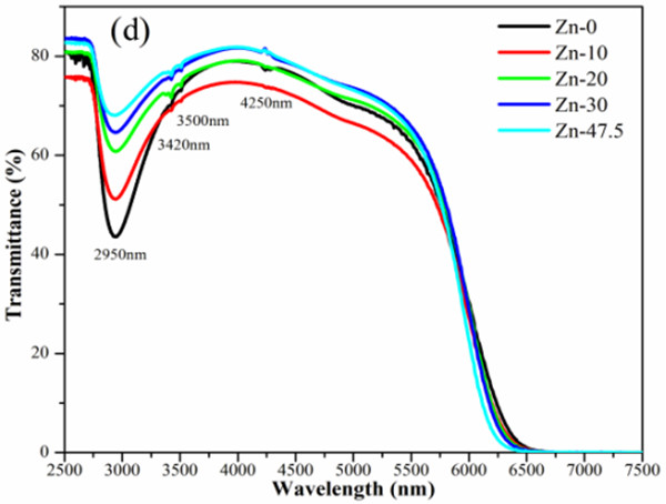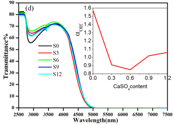 由圖可見,加入微量的化學澄清劑硫酸根離子,可以讓玻璃的近中紅外發(fā)光大幅度的增強。由于玻璃基質(zhì)成分并沒有變化,發(fā)光增強可以認為是由玻璃中的羥基含量減少造成的,而羥基含量減少是由于硫酸根離子在高溫分解釋放出的氣體造成玻璃中的羥基含量大幅度降低。