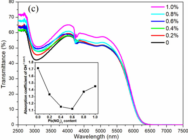 圖2 玻璃基質(zhì)成分為67.5TeO2-10PbF2-(10-x)PbO-5YF3-1ErF3-1.5YbF3- xPb(NO3)2 (x=0, 0.2, 0.4, 0.6, 0.8, 1.0)的(a)近中紅外發(fā)光,(b)上轉(zhuǎn)換發(fā)光,(c)紅外透射光譜。由圖可見,加入微量的化學澄清劑硝酸根離子,可以讓玻璃的近中紅外發(fā)光大幅度的增強,而上轉(zhuǎn)換發(fā)光強度基本上沒有變化。由于玻璃基質(zhì)成分并沒有變化,發(fā)光增強可以認為是由玻璃中的羥基含量減少造成的,而硝酸根離子在高溫分解釋放出的氣體造成玻璃中羥基含量的減少。