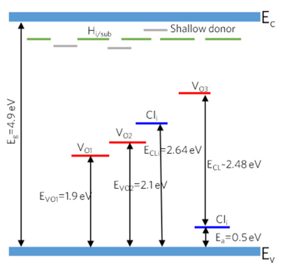 此外,本文研究了氫和氯摻雜有關的缺陷態(tài),在圖9(c)中可以觀察到,深能級缺陷狀態(tài)可以被氫鈍化,得到Ga2O3中的一個淺層施主。MSM ε-Ga2O3 SBPD快速的響應速度歸功于這些缺陷能級的鈍化。同樣地,如圖9(d)所示,Cl作為間隙雜質時,將在ε-Ga2O3的帶隙中引入位于VBM上方的兩個缺陷能級。當Cl作為替位雜質,缺陷移動到導帶底(CBM),但在價帶頂(VBM)附近仍然存在深能級缺陷態(tài)。圖11給出了ε-Ga2O3能帶圖。
