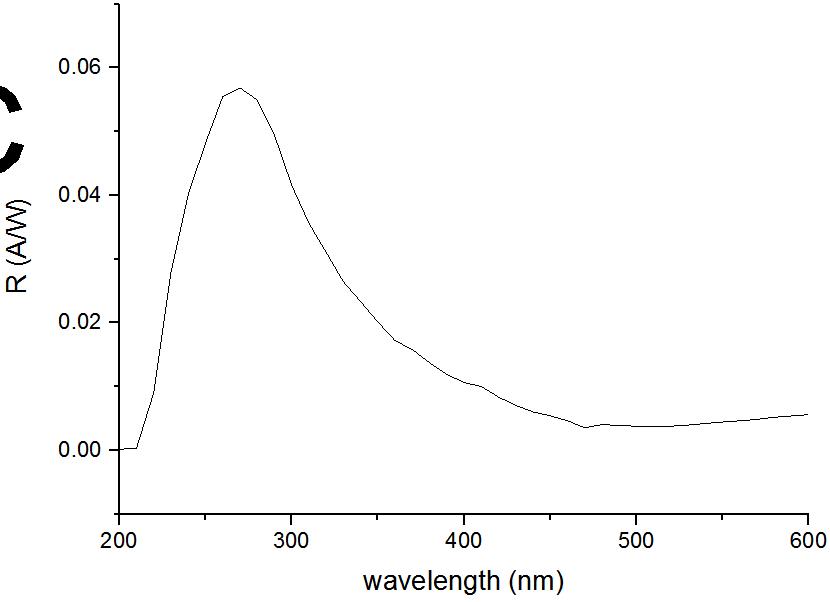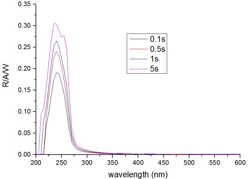 圖3.1和3.2顯示了樣品在不同延時(shí)下信號(hào)波長(zhǎng)的關(guān)系。發(fā)現(xiàn)峰值波長(zhǎng)為 240nm (5.17 eV),而帶邊是根據(jù)曲線導(dǎo)數(shù)值在 275nm (4.51 eV)。分別在 0.1 s 和 5s 的延時(shí)時(shí)間下測(cè)得的峰值響應(yīng)度值分別為 0.19A/W 和 0.3 A/W,說明樣品的響應(yīng)時(shí)間很慢,因此針對(duì)此類樣品的測(cè)試需要測(cè)試其響應(yīng)時(shí)間。