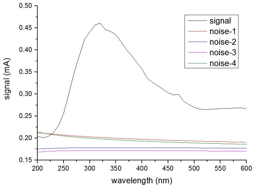 從3.5和3.6圖可以發(fā)現(xiàn),金剛石/Ga2O3異質(zhì)結(jié)器件的峰值波長(zhǎng)是320nm,在320nm器件的信號(hào)強(qiáng)度(0.461mA)是硅探測(cè)器(1.15uA)的信號(hào)強(qiáng)度的400倍。3.5圖顯示器件的暗電流比較大,且不同時(shí)間段暗電流大小會(huì)有區(qū)別,所以扣除暗電流會(huì)不太準(zhǔn)確。