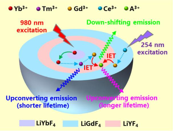 華南理工大學(xué)課題組近日成功合成了LiGdF4為基質(zhì)核殼納米結(jié)構(gòu),該核殼結(jié)構(gòu)中較遠(yuǎn)位置的釓離子Gd+3通過表面能量轉(zhuǎn)化與摻雜的離子可實(shí)現(xiàn)上轉(zhuǎn)換和下轉(zhuǎn)換熒光發(fā)射。使用980nm和254 nm不可見的雙波長激發(fā)下,可以實(shí)現(xiàn)單個(gè)納米粒子的三通道可見區(qū)熒光發(fā)射。相關(guān)成果以“Tri-channel photon emission of lanthanides in lithium-sublattice core-shell nanostructures for multiple anti-counterfeiting”為題發(fā)表于Chemical Engineering Journal 397 (2020) 125451。