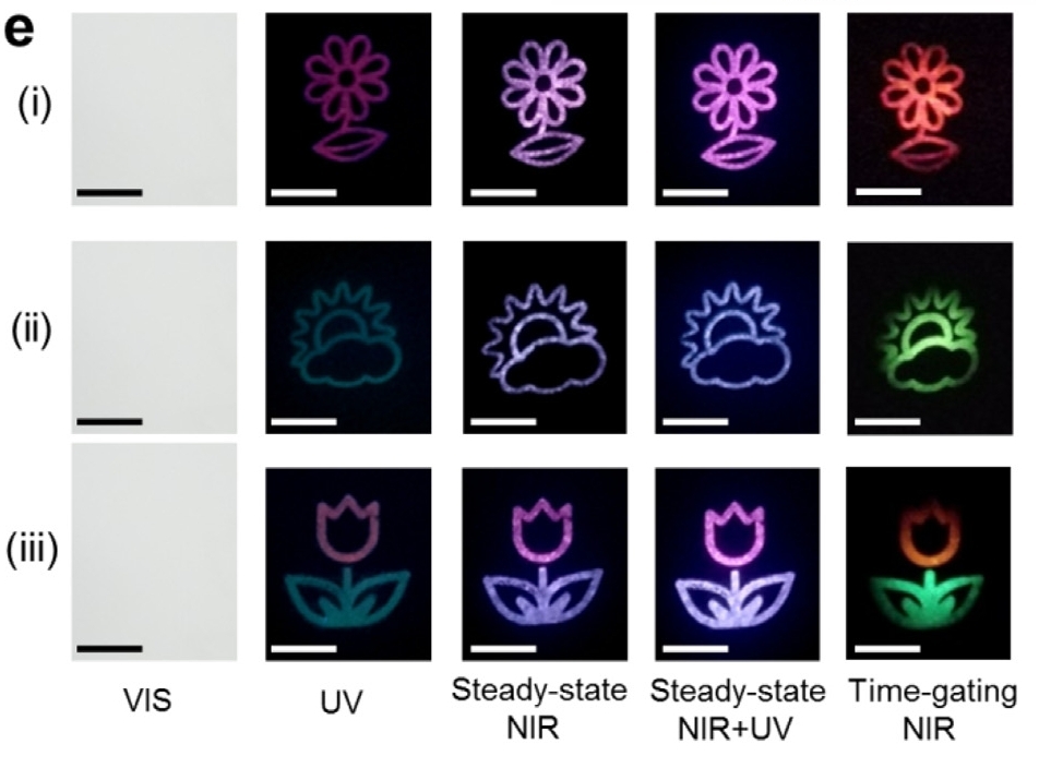 下圖為華南理工大學(xué)課題組將合成材料應(yīng)用到熒光防偽中,(i)(ii)(iii)分別為摻雜不同激活劑的鋰集納米核殼材料。三幅圖案在可見光照射下,在紫外(254nm)照射下,穩(wěn)態(tài)近紅外(980nm)照射下,穩(wěn)態(tài)近紅外(980nm)+紫外(254nm)同時(shí)照射下,和時(shí)間門控近紅外(980nm)照射下顯現(xiàn)出不同的顏色??梢姽庹丈鋾r(shí)均不能顯現(xiàn),展現(xiàn)其隱形性能,不同照射條件,圖案顯現(xiàn)出明顯的差異,同時(shí)因?yàn)樯限D(zhuǎn)換有著較長的壽命,且不同輻射能級(jí)的壽命不同,又增加了時(shí)間維度的防偽功能。