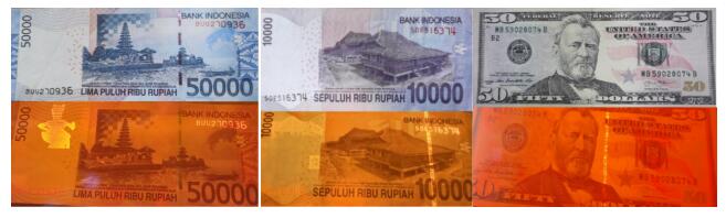 下圖為一些國外紙幣在日光燈和紫外燈下的對(duì)比圖片。