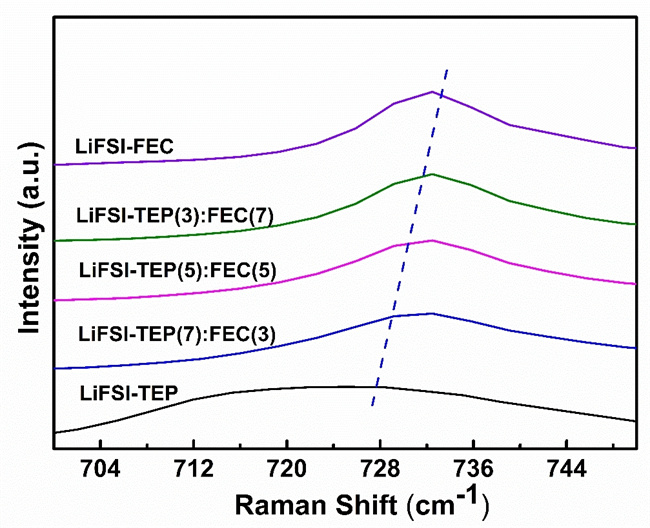 圖1:LiFSI-TEP(黑線)的峰值位置代表 [Li-TEP]+ 對。 LiFSI-FEC(紫線)的峰值位置代表 [Li-FEC]+ 對,隨著TEP/FEC混合溶劑中FEC溶劑量的增加,LiFSI-TEP:FEC 電解質(zhì)的峰值位置更接近LiFSI-FEC電解質(zhì)的峰值位置。
