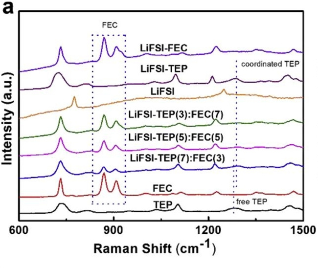天津大學(xué)孫潔教授課題組采用了一種新的電解質(zhì)體系,即將雙(氟磺?;啺罚↙iFSI)添加到阻燃助溶劑磷酸三乙酯(TEP)和氟代碳酸乙烯酯(FEC)的混合溶劑中,開發(fā)了LiFSI-TEP/FEC作為高效磷基快充型鋰離子電池負(fù)極的電解液體系。利用拉曼光譜儀(Finder Insight,ZOLIX)記錄的拉曼光譜圖進(jìn)一步研究了 [Li-solvent]+ 結(jié)構(gòu)。圖1和2表明隨著TEP/FEC混合溶劑中FEC溶劑量的增加,LiFSI-TEP:FEC 電解質(zhì)的峰值位置更接近LiFSI-FEC電解質(zhì)的峰值位置,證明了 Li+溶劑化結(jié)構(gòu)會優(yōu)先在磷負(fù)極上還原以及電解質(zhì)中FSI−和FEC溶劑還原分解,形成富含氟化鋰(LiF)的固體電解質(zhì)界面(SEI)。這種穩(wěn)定的SEI有效緩解了磷負(fù)極的體積膨脹,減少電解質(zhì)中磷負(fù)極的副反應(yīng),提高了磷負(fù)極的快速充電性能。因此拉曼光譜將有助于更好地了解FEC和TEP在SEI中的作用,并為合理構(gòu)建磷負(fù)極表面或其他合金型負(fù)極表面的穩(wěn)定SEI提供一種有效的表征手段。