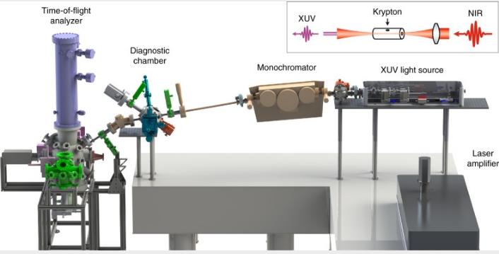 圖2、基于XUV的時(shí)間分辨ARPES裝置。插圖(右上)顯示了近紅外(NIR)光通過氪氣產(chǎn)生高次諧波(HHG)以產(chǎn)生極紫外(XUV)光的實(shí)驗(yàn)布局[Nature Communications, 06 Aug 2019, 10(1):3535]