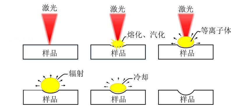 激光誘導(dǎo)等離子體光譜(laser-induced plasma spectroscopy, LIPS)技術(shù)是一種原子光譜分析技術(shù),原理如圖1所示。該技術(shù)通過(guò)將高能激光脈沖直接聚焦于樣品表面,瞬間完成取樣、原子化及激發(fā)的全過(guò)程,同時(shí)利用光譜儀采集樣品表面激光誘導(dǎo)等離子體的發(fā)射光譜,完成被測(cè)樣品所含元素的定性和定量分析[1]。與原子熒光光譜法(AFS)、原子吸收光譜法(AAS)、(ICP-AES)、電感耦合等離子體質(zhì)譜法(ICP-MS)等常規(guī)檢測(cè)方法相比,LIPS無(wú)需復(fù)雜的樣品前處理,具有操作簡(jiǎn)單、檢測(cè)速度快、可原位檢測(cè)、可現(xiàn)場(chǎng)檢測(cè)、可實(shí)時(shí)檢測(cè)等優(yōu)點(diǎn)[2,3]。然而,與現(xiàn)有成熟的元素檢測(cè)技術(shù)相比,LIPS檢測(cè)靈敏度較低,制約了LIPS技術(shù)的推廣和應(yīng)用;因此,激光誘導(dǎo)等離子體光譜增強(qiáng)技術(shù)被廣泛的關(guān)注和研究。雙脈沖增強(qiáng)LIPS、磁約束增強(qiáng)LIPS、空間約束增強(qiáng)LIPS、納米顆粒增強(qiáng)LIPS是目前常用的LIPS增強(qiáng)技術(shù),本文對(duì)以上技術(shù)進(jìn)行介紹,并對(duì)其技術(shù)原理和技術(shù)特點(diǎn)進(jìn)行分析。