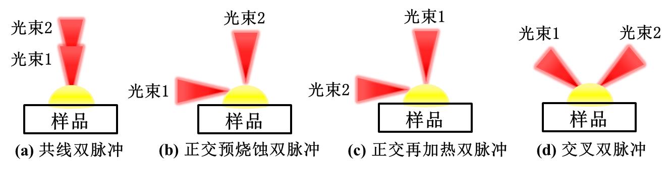 雙脈沖增強(qiáng)LIPS(Double-Pulse LIPS, DP-LIPS)是一種簡(jiǎn)單、有效的等離子體輻射光譜增強(qiáng)方法,通過(guò)將兩束激光按時(shí)間先后順序燒蝕樣品,可以獲得比傳統(tǒng)單脈沖LIPS更強(qiáng)的等離子體輻射光譜。根據(jù)兩束激光的空間關(guān)系和時(shí)間順序,雙脈沖LIPS可以分為共線雙脈沖LIPS、正交預(yù)燒蝕雙脈沖LIPS、正交再加熱雙脈沖LIPS和交叉雙脈沖LIPS,如圖2所示。