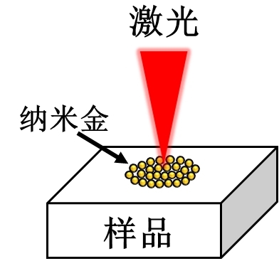 納米顆粒增強(qiáng)LIPS(Nanoparticle-Enhanced LIPS, NE-LIPS)通過(guò)將尺寸在納米至百納米量級(jí)的金屬顆粒沉積在樣品表面,利用激光與納米顆粒作用過(guò)程中納米顆粒傳導(dǎo)電子震蕩和表面等離子激元共振提高激光誘導(dǎo)等離子體輻射光譜強(qiáng)度。NE-LIPS的光譜增強(qiáng)機(jī)理主要分為兩個(gè)方面:首先,照射在納米顆粒表面的激光脈沖可以誘導(dǎo)納米顆粒中傳導(dǎo)電子產(chǎn)生相干和集體振蕩,提高了納米顆粒附近以及納米顆粒間隙的電場(chǎng)強(qiáng)度,在局部增強(qiáng)了入射激光的脈沖能量,使激光誘導(dǎo)擊穿光譜強(qiáng)度提升;其次,激光脈沖與納米顆粒的表面等離子激元共振(Surface Plasmon Resonance, SPR),提高了納米顆粒的熱吸收效率,納米顆粒吸收了大部分激光能量并有效加熱樣品,使激光誘導(dǎo)擊穿光譜強(qiáng)度提升[12]。圖6是納米金增強(qiáng)LIPS示意圖。
