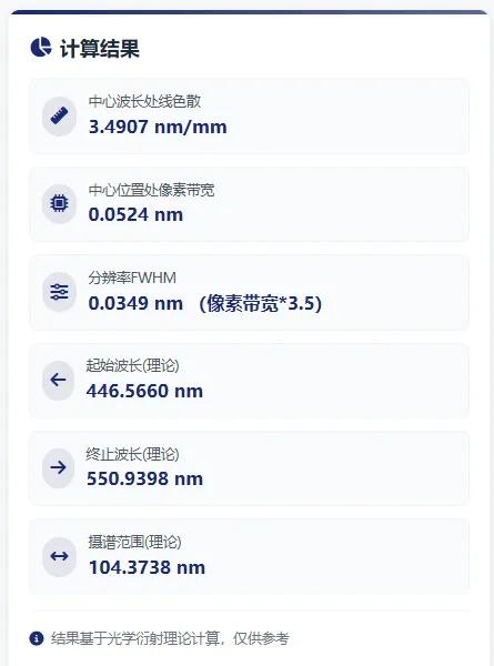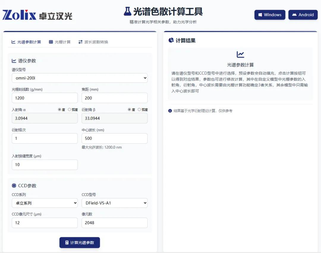 近日,卓立漢光官網新上線光譜色散計算工具,專為譜儀與線陣探測器的性能參數(shù)計算打造,能幫您高效解決核心計算需求。這款工具基于光柵方程進行理論計算,可快速輸出關鍵性能參數(shù),包括分辨率、光譜覆蓋范圍,以及光柵的色散能力?,F(xiàn)開放至網頁端,希望能為行業(yè)內有需要的研發(fā)及技術人員提供便利。