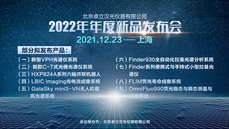 北京卓立漢光儀器有限公司將于2021年12月23日在上海舉行2022年年度新品發(fā)布會,多款自主研發(fā)的光電新品將重磅亮相,為新型材料、生物醫(yī)學(xué)、科學(xué)研究、食藥、環(huán)保等領(lǐng)域的用戶提供更優(yōu)的光電檢測技術(shù)和服務(wù),期待與您相聚。